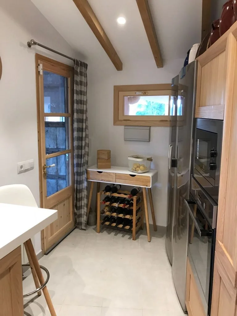 Reformamos esta cocina rústica en Mallorca manteniendo sus vigas de pino y sus elementos singulares. Añadimos una encimera blanca con armarios de roble para preservar el carácter tradicional sin renunciar a la funcionalidad contemporánea.